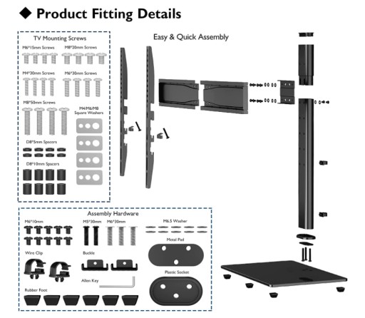 - Prosty montaż - pochodzi z wszystkich niezbędnych urządzeń i instrukcji instalacji. Nie musisz wiercić w ścianie, zainstaluj stojak na telewizor bez żadnych kłopotów.