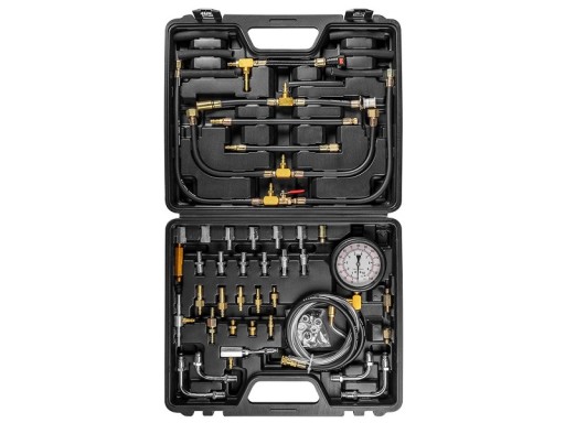Zestaw do testowania systemów wtryskowych w silnikach benzynowych, zakres do 140 PSI / 10 bar. Do ukladów: układ K - i KE - Jetronic sis, układ KE - Jetronic kic, układ L - Jetronic liw, pomiar ciśnienia w pompach, pomiar powrotu ciśnienia.
