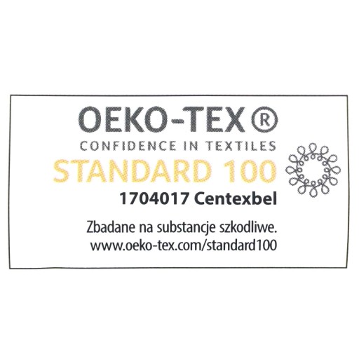 Prześcieradło posiada Certyfikat Tekstylia Godne Zaufania Oeko-Tex standard to certyfikat świadczący o jakości produktów tekstylnych i włókienniczych, które mają bezpośrednią styczność ze skórą człowieka. Certyfikat potwierdza bezpieczeństwo produktu.