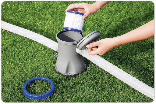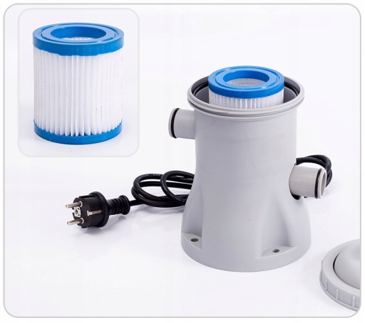 - Przed przystąpieniem do wymiany filtra, należy odłączyć pompę od zasilenie elektrycznego - ta czynność powinna być wykonana przez osobę dorosłą. Po odkręceniu górnej pokrywy i wyjęciu uszczelki oraz przykrywki filtra, można już wyciągnąć właściwe urządzenie. Najbardziej efektywne oczyszczanie przeprowadza się przy użyciu wody pod wysokim ciśnieniem (np. z węża ogrodowego). Jeśli nie przyniesie to spodziewanego rezultatu, filtr należy wymienić.