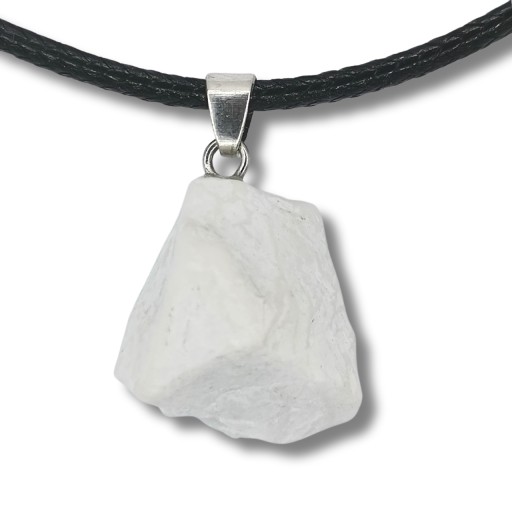 Wisiorek z Bryłki surowego naturalnego HOWLITU BIAŁEGO. W kamieniu został wywiercony otwór, w którym zamocowany jest trzpień z krawatówką, który można zawiesić na łańcuszku lub rzemyku z eko skóry