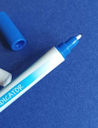 Dwustronny, jeden koniec wymazuje niebieski atrament, drugi w kolorze niebieskim pozwala nanieść poprawkę
