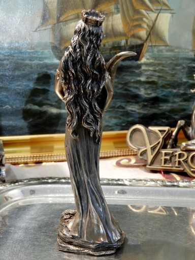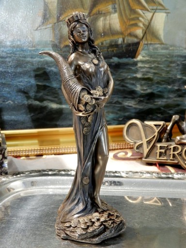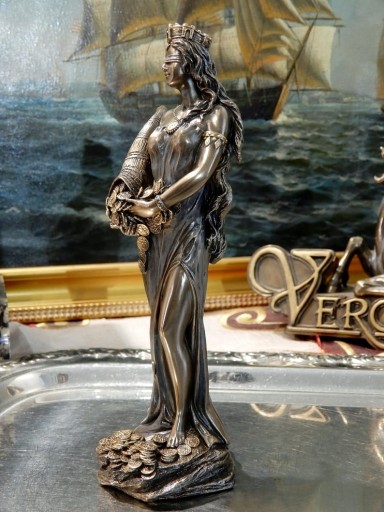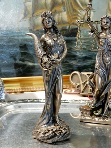 Zapraszam do zakupu wspaniałej figurki przedstawiającej boginię Fortunę, odpowiedniczkę Tyche w mitologii greckiej, to bogini i uosobienie przypadku, „ślepego” losu, szczęścia (pomyślności, powodzenia) i nieszczęścia; opiekunka miast, żeglarzy. Przedmiot znacznie lepiej wygląda w naturze.