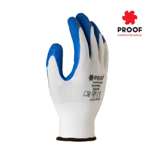 Klasyczne rękawice nylonowe w kolorze białym pokryte niebieskim lateksem.