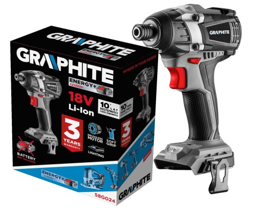 Wydajna zakrętarka współpracująca z akumulatorami 18V Li-Ion GRAPHITE Energy+. Przystosowana jest do wkręcania i wykręcania wkrętów i śrub w drewnie, metalu, tworzywach sztucznych. Urządzenie wyposażono w elektryczny hamulec silnika pozwalający na szybkie zatrzymywanie wrzeciona oraz diodę LED, podświetlającą miejsce pracy. Ergonomiczny kształt uchwytu i zoptymalizowana długość całkowita zakrętarki pozwalają na efektywną pracę w każdych warunkach.