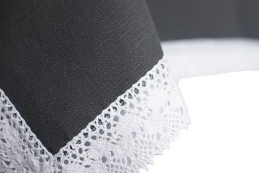 Ekskluzywny, gruby bieżnik/obrus z widocznymi zgrubieniami nitki do nowoczesnych wnętrz z duszą ozdobiony bawełnianą koronką (szeroką na około 5 cm). Koronka może nieznacznie odbiegać od tej na zdjęciu, zależy to od stanów magazynowych w hurtowni.