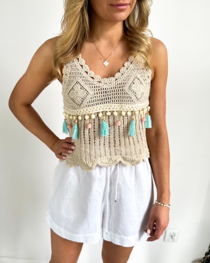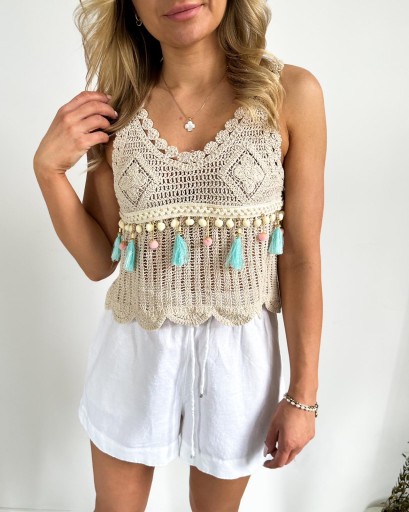 Bluzka pleciona makrama z ozdobami boho w kolorze beżowym. Rozmiar uniwersalny.