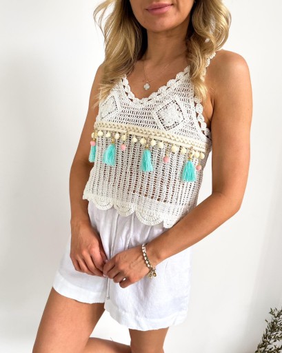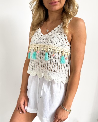 Bluzka pleciona makrama z ozdobami boho w kolorze śmietankowym. Rozmiar uniwersalny.