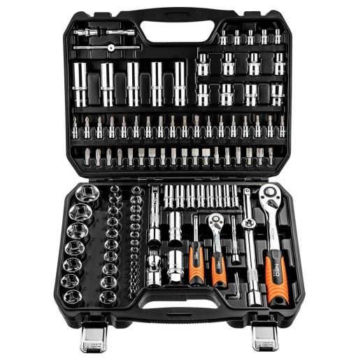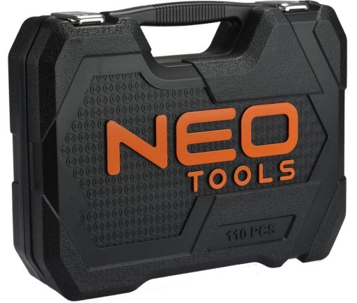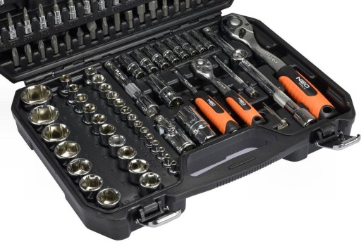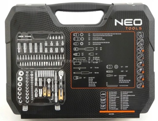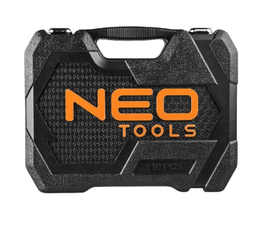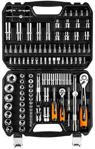 Zestaw kluczy nasadowych 1/2" i 1/4" NEO (nr ref. 08-666) składa się ze 110 elementów, wykonanych z wysokiej jakości stali chromowo-wanadowej.