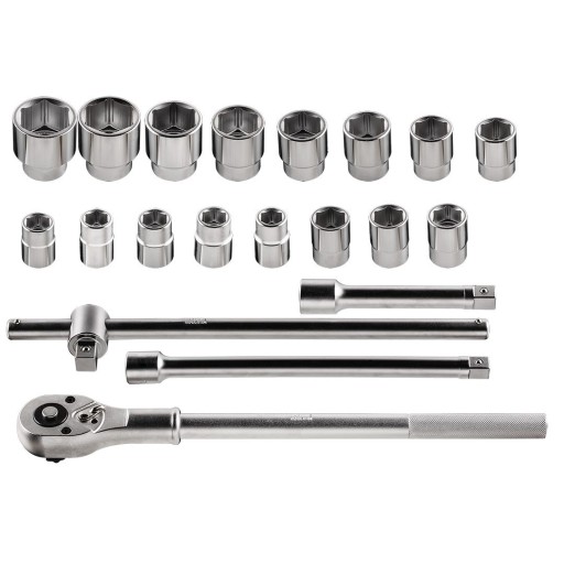Zestaw kluczy nasadowych 3/4" NEO składa się z 21 elementów wykonanych z wysokiej jakości stali chromowo-wanadowej. W skład zestawu wchodzi grzechotka 500 mm, wyposażona w trwały mechanizm zapadkowy (24 zęby).