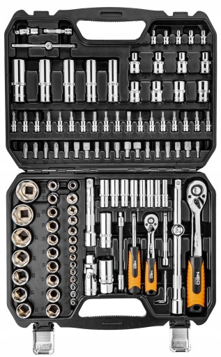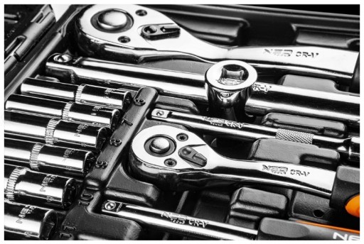Zestaw kluczy nasadowych 1/2" i 1/4" NEO (nr ref. 08-910) składa się ze 110 elementów, wykonanych z wysokiej jakości stali chromowo-wanadowej. W skład zestawu wchodzą grzechotki 1/2" i 1/4" (trwały mechanizm zapadkowy - 72 zęby) z odgiętymi, ergonomicznymi rękojeściami. Zestaw zawiera bogaty pakiet nasadek sześciokątnych o dwóch długościach (w rozmiarach od 4 do 32 mm), nasadek Torx (E4 – E24) oraz końcówek wkrętakowych (płaskie, krzyżowe, sześciokątne, Torx). Uzupełnieniem całości jest szeroki pakiet akcesoriów. Całość w odpowiednio dopasowanej i mocnej walizce z metalowymi zatrzaskami. Niezawodność produktu potwierdza 25-letnia gwarancja. Marka NEO spełnia oczekiwania profesjonalistów.