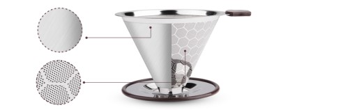 - Z rozmiarem oczek 800 ściegów na cal kwadratowy, aby zapewnić drobniejsze filtrowane cząsteczki. Aby uzyskać najlepszy smak kawy, zalecamy przygotowanie średnio zmielonej kawy z filtrem stałym.