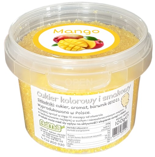 Pragniemy przedstawić naszą ofertę - kolorowy cukier 100g w wiaderku, żółty o smaku i zapachu mango.