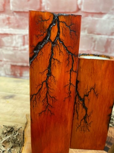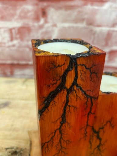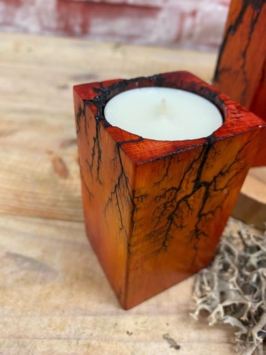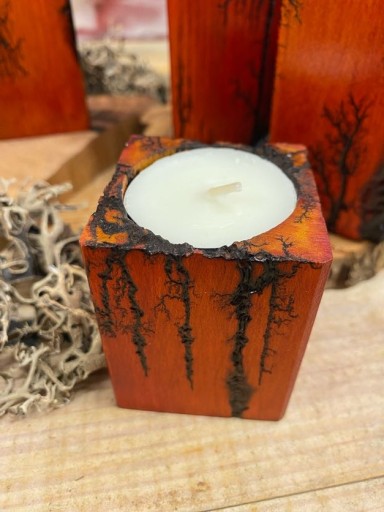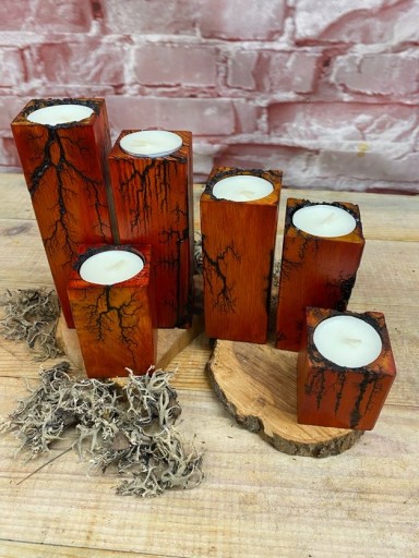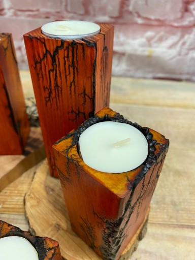 Świeczniki na tealighty wykonane z drewna bukowego. Drewno jest wypalane prądem, który tworzy wyjątkowe wzory, następnie barwione bejcą wodną. Świeczniki są lakierowane.
