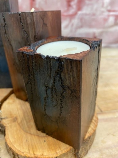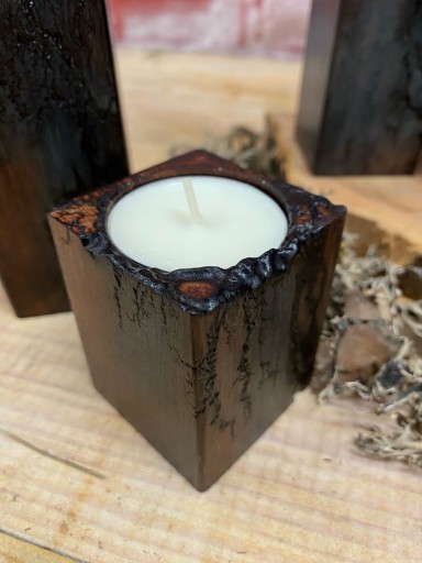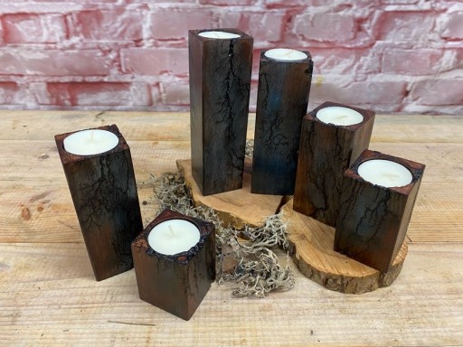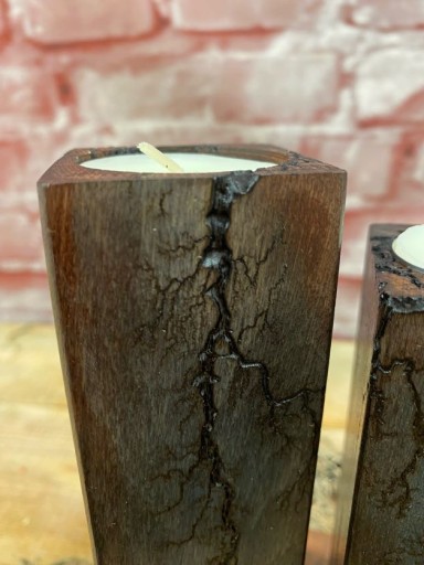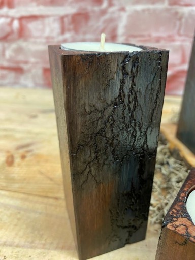 Świeczniki na tealighty wykonane z drewna bukowego. Drewno jest wypalane prądem, który tworzy wyjątkowe wzory, następnie barwione bejcą wodną. Świeczniki są lakierowane.
