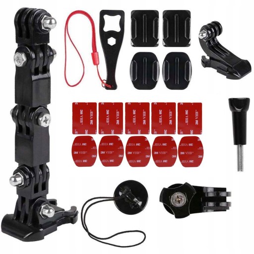Zestaw super mocnych wklejek z szybkozłączkami oraz regulowanym ramię umożliwiających umieszczenie kamery do różnych powierzchni płaskich i zakrzywionych, od dachu samochodu, po kask narciarski.