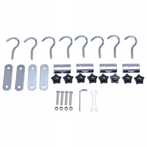 - Z akcesoriami montażowymi: 8 haków, 4 elementy żelazne, 8 gałek z tworzywa sztucznego, śruby i narzędzia montażowe