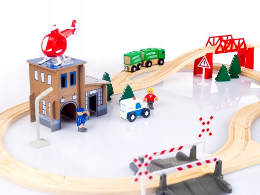 Drewniana kolej z posterunkiem policji to zestaw 80 elementów. Całość składa się z wielu ciekawych elementów w tym np. pojazdów, znaków drogowych, drzew, szlaban i mostek. Duża liczba akcesoriów sprawia, że dzieci będą się bawić zabawką bez końca, przy okazji rozwijając również swoją zręczność, koordynację wzrokowo – ruchową, kreatywność oraz wyobraźnię.
