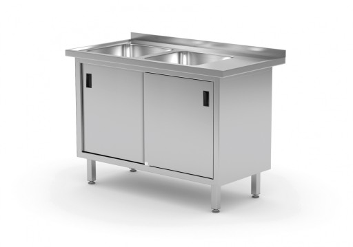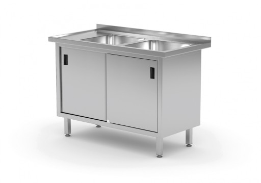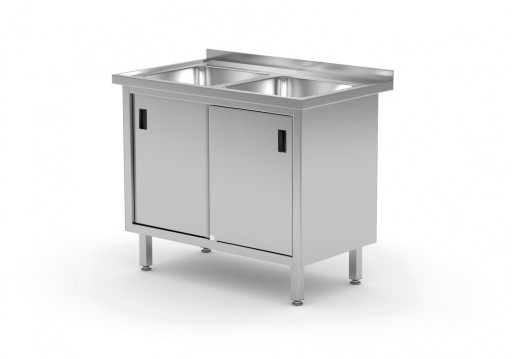 - Wysokiej jakości stół z 2 zlewami i szafką z drzwiami suwanymi, wykonany ze stali nierdzewnej (AISI 304 - blat i komora, AISI 430 - konstrukcja)