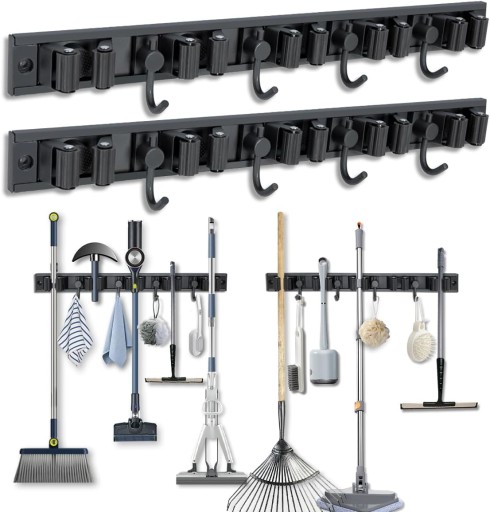 Uchwyt na miotłę, 2 sztuki, uchwyt na narzędzia ogrodowe z 5 uchwytami, 4 haczyki, przesuwany, zdejmowany, uchwyt ścienny, miotła, uchwyt na narzędzia ze stali nierdzewnej, samoprzylepny, do domu, kuchni, łazienki