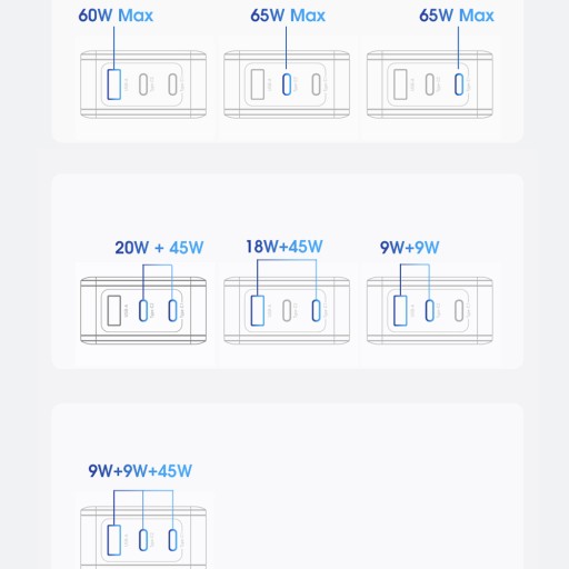 - przy ładowaniu dwóch urządzeń w tym samym czasie, zaleca się użycie portów C1 + C2 (maks. 65W) lub C1 + A (maks. 63W). Nie zaleca się stosowania kombinacji C2 + A, ponieważ moc wyjściowa będzie w tym przypadku niewielka (15W Max).