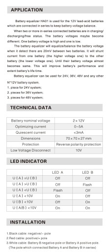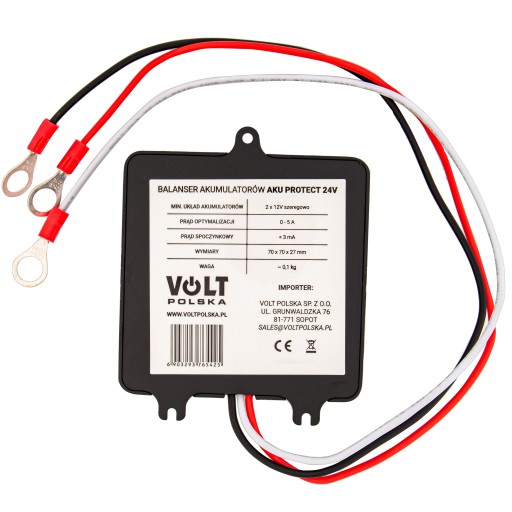 BALANSER AKU PROTECT 24V jest używany do 12V akumulatorów połączonych szeregowo, aby utrzymać równe napięcie akumulatorów. Może być stosowany do akumulatorów AGM, żelowych.