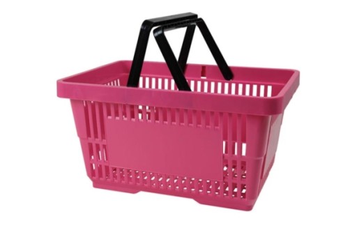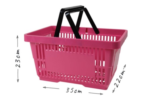Koszyk sklepowy 22l o szerokości 35cm, głębokości 22cm i wysokości 23cm. Wykonany z tworzywa sztucznego w kolorze różowym. Na froncie pojemnika znajduje się miejsce z przeznaczeniem na logo. Koszyk posiada dwie, składane, czarne rączki. Najbardziej popularny model.