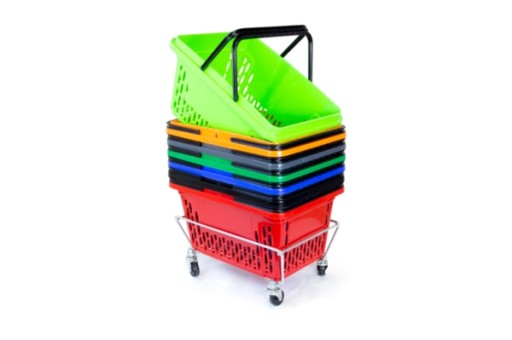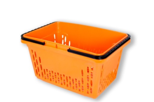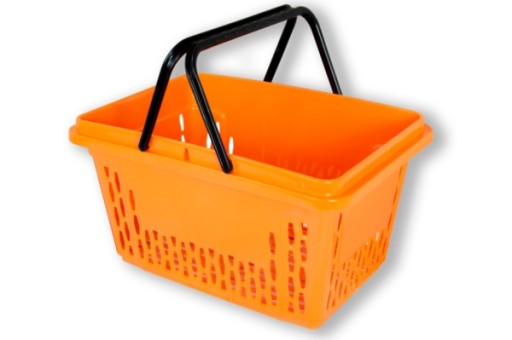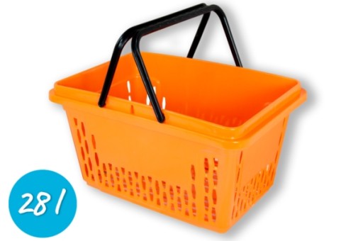 Koszyk sklepowy 28l o szerokości 49cm, głębokości 34cm i wysokości 27cm. Wykonany z tworzywa sztucznego w kolorze pomarańczowym. Na froncie pojemnika znajduje się miejsce z przeznaczeniem na logo. Koszyk posiada dwie, składane, czarne rączki.