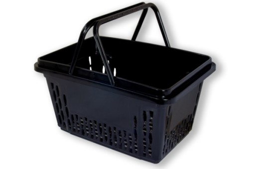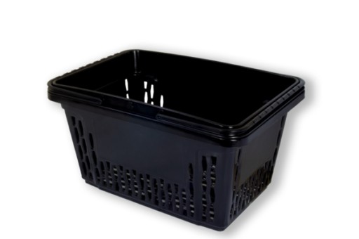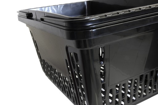 Koszyk sklepowy 28l o szerokości 49cm, głębokości 34cm i wysokości 27cm. Wykonany z tworzywa sztucznego w kolorze czarnym. Na froncie pojemnika znajduje się miejsce z przeznaczeniem na logo. Koszyk posiada dwie, składane, czarne rączki.
