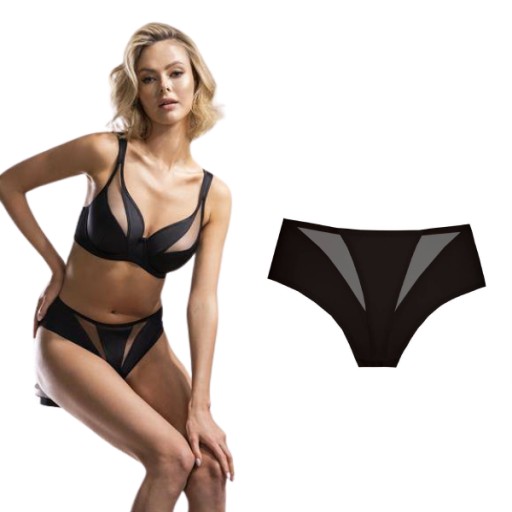Klasyczne figi w kolorze czarnym. Z przodu przezroczyste wstawki w kształcie trójkątów. Tył prosty, cały gładki. Skład: 83% poliamid, 12% elastan, 5% bawełna.
