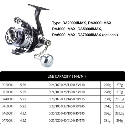 ⛵W pełni metalowy kołowrotek to wysokiej jakości, odporny na zużycie kołowrotek przeznaczony dla poważnych wędkarzy. Wykonany z najwyższej jakości materiałów, ten kołowrotek ma w pełni metalowy korpus i rotor, zapewniając doskonałą wytrzymałość i trwałość. Płynny i niezawodny system hamulca zapewnia bezproblemowe łowienie, a łożysko rolkowe zapobiegające skręcaniu żyłki i metalowe łożyska kulkowe zapewniają maksymalne osiągi i długowieczność. ⛵Dane techniczne: ⛵Typ: DA2000IIMAX, DA3000IIMAX, DA4000IIMAX, DA5000IIMAX, DA6000IIMAX, DA7000IIMAX (opcjonalnie) ⛵Główny materiał: metal ⛵Siła uciągu: max. 15kg ⛵Łożysko: 3 #43;1BB ⛵Pojemność linki: ⛵DA2000IIMAX: 0.24mm/160m, 0.28mm/130m, 0.33mm/110m ⛵DA3000IIMAX: 0.24mm/180m, 0.28mm/150m, 0.33mm/ 130m ⛵DA4000IIMAX: 0.28mm/165m, 0.33mm/145m, 0.38mm/125m .45mm/145m ⛵DA7000IIMAX : 0.35mm/230m, 0.40mm/210m, 0.45mm/175m ⛵Wielkość opakowania: ⛵DA2000IIMAX, DA3000IIMAX, DA4000IIMAX, DA5000IIMAX: 130*122*76mm/5.1*4.8*3.0in ⛵DA6000IIMAX, DA7000IIMAX: 150*142*90mm/5.9*5.6*3.5in , DA4000IIMAX, DA5000IIMAX: 291 g / 10,3 uncji ⛵DA6000IIMAX , DA7000IIMAX: 403g / 0.9lb ⛵Lista pakowania: ⛵1 * Kołowrotek