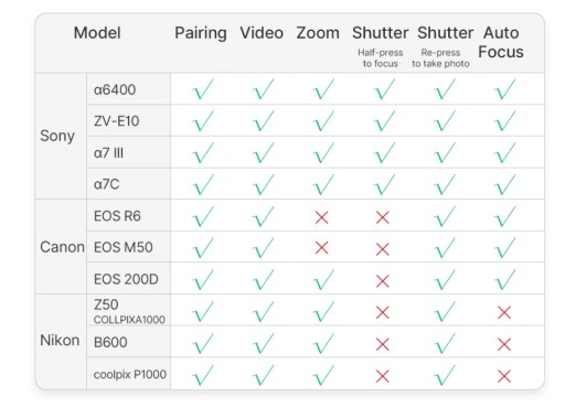 - Obsługiwane funkcje: wyzwalanie zdjęć, uruchamianie i zatrzymywanie nagrywania filmów oraz sterowanie ZOOM'em i ostrością (dla wybranych urządzeń)