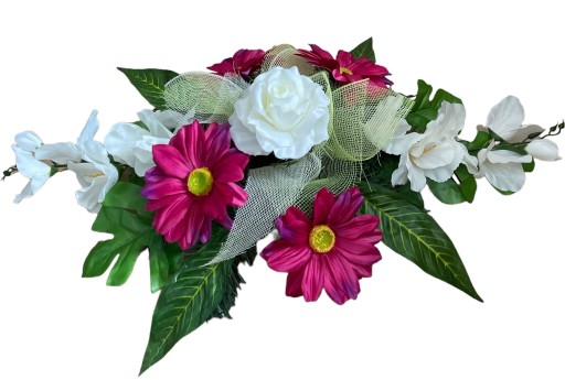 Stroik całoroczny, bardzo trwały z kwiatów sztucznych ,doniczka zalana betonem dzięki czemu jest stabilna.