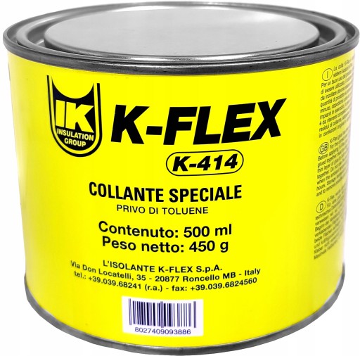Kleje K-FLEX® K 414 zostały specjalnie opracowane do materiałów izolacyjnych K-FLEX® ze spienionego kauczuku i polietylenu. Szczelnie sklejone krawędzie i połączenia odporne są na starzenie i działanie czynników atmosferycznych, a także pozwalają utrzymać właściwości techniczne materiału izolacyjnego.