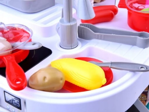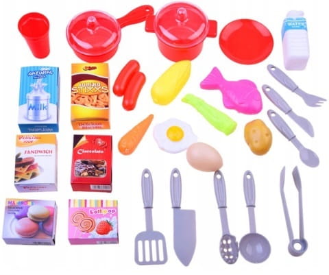 - akcesoria spożywcze imitujące jedzonko ( takie jak ryba, parówki, jajko, jajko sadzone, kukurydza, marchewka, ziemniak, , mleko w kartonie, mleko w butelce, ciasteczka, kawa).