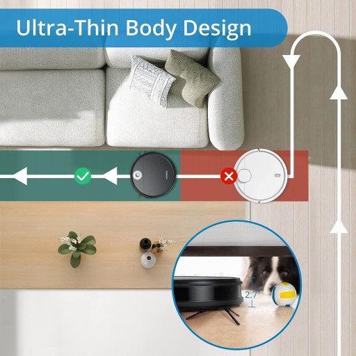 - 【Small Body Design】 Z wysokością 2,7 cala i średnicą 10,7 cala. Robot odkurzający może z łatwością pracować pod lub wokół mebli, takich jak sofy, łóżka i stoły. Może nawet pokonywać przeszkody o wysokości do 0,6 cala bez blokowania przez małe schody lub grube dywany.
