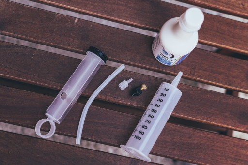 7️⃣ Konserwacja strzykawki: Przepłucz strzykawkę ciepłą wodą. Przetłocz wodę przez wężyk i adapter.