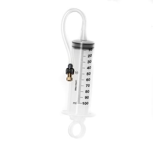 Profesjonalna strzykawka do nabijania płynu uszczelniającego "mleka" do opon i dętek rowerowych. Strzykawka posiada miarkę, wężyk i uniwersalny adapter odpowiedni do wszystkich typów zaworów D/V, A/V, francuskich i włoskich. Produkt może być stosowany oponach bezdętkowych i tradycyjnych, wyposażonych w dętki. Pojemność 100ml.