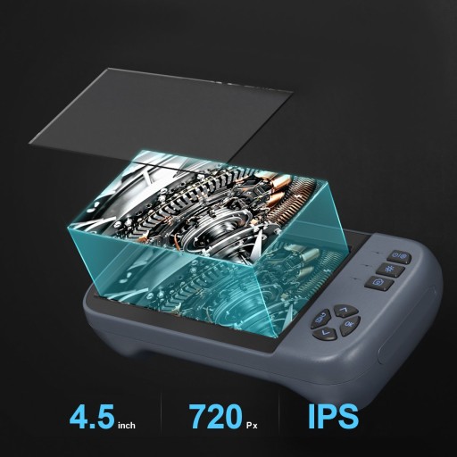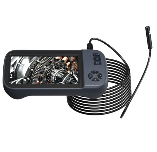 z 4,5-calowym ekranem IPS o rozdzielczości: 480*854P z funkcją robienia zdjęć oraz nagrywania wideo. W pełni wodoodporna kamera posiadająca 8 diod LED z regulowanym natężeniem światła. Ma bardzo elastyczny i wytrzymały przewód o długości aż 10 metrów.