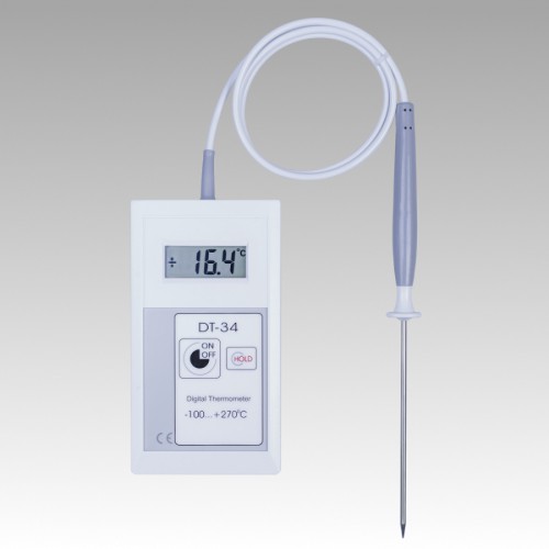 Termometr elektroniczny typu DT 34 z sondą pomiarową na trwale połączoną z miernikiem.