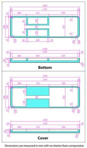 - Wymiary wewnętrzne (dł. x szer. x wys.): 119 x 34.5 x 7 cm (długość korpusu: 53 cm)