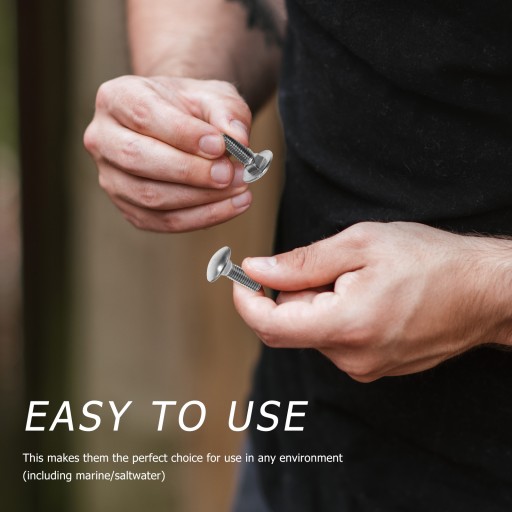 Okrągła kopulasta głowa z kwadratową szyją. Opakowanie zawiera po pięćdziesiąt sztuk śrub. Platerowane dla odporności na korozję. Nadaje się do użytku wewnątrz lub na zewnątrz. Wykonane z litej stali nierdzewnej pozwalają na stosowanie ich w różnych środowiskach, w tym w słonej wodzie, słodkiej wodzie, wewnątrz i na zewnątrz.