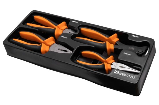 Zestaw 4 sztuk szczypiec umieszczonych we wkładzie typu A do wózka warsztatowego.
