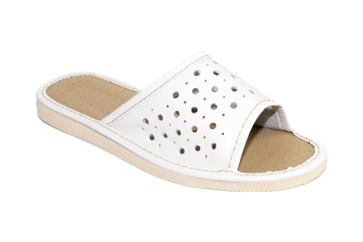 - Pantofle wykonane są z wysokiej jakości skóry ekologicznej, łatwej w utrzymaniu w czystości. Kapcie są bardzo lekkie dzięki czemu stopa może odpocząć. Pantofle posiadają również wkładkę profilującą, która zapewnia prawidłowe ułożenie stopy.