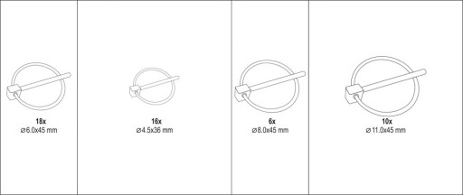 Zestaw 50 sztuk zabezpieczeń rolniczych z kółkiem blokującym. Zestaw zawiera rozmiary od 4.5x36 mm do 11.0x45 mm. Całość umieszczono w wygodnym opakowaniu typu "sortownik".