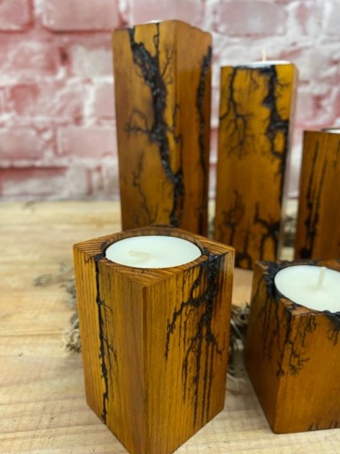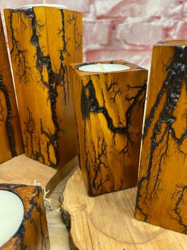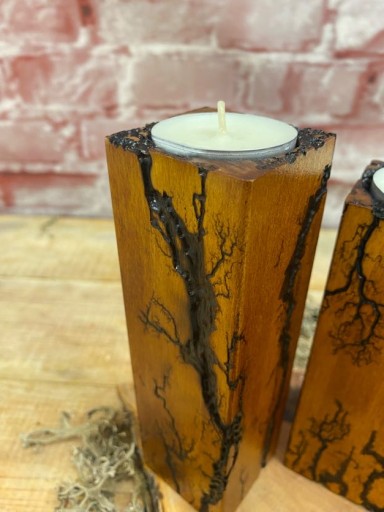 Świeczniki na tealighty wykonane z drewna bukowego. Drewno jest wypalane prądem, który tworzy wyjątkowe wzory, następnie barwione bejcą wodną. Świeczniki są lakierowane.