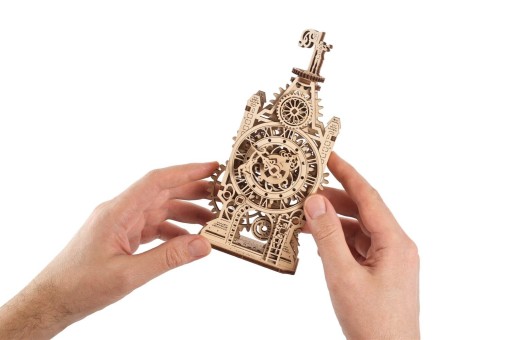 ↘️ Mini-model Old Clock Tower od UGEARS wprowadza czarującą średniowieczną atmosferę do każdego domu lub biura ☺️. Ten piękny drewniany model Wieży Zegarowej do samodzielnego składania to mechanizm w formie wieży z tarczą zegara, ruchomymi kołami zębatymi, ruchomym wahadłem, kapryśnymi postaciami i łopatką pogodową na szczycie ❤️.