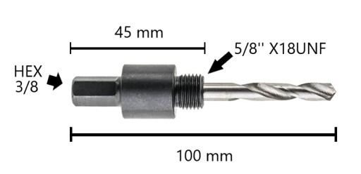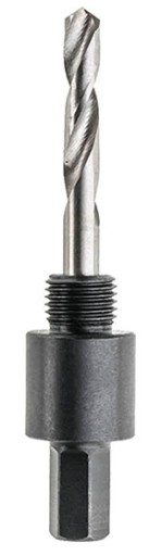 Adapter z wiertłem prowadzącym odpowiedni do współpracy z otwornicami o średnicy 14–30 mm. Standardowa końcówka HEX 3/8" (9,35 mm) sprawia, że adapter będzie pasować do większości dostępnych na rynku wiertarek. Wyposażony w gwint standardowy pasujący do większości otwornic różnych producentów - 5/8" X 18UNF. Wiertło prowadzące dzięki profilowanej końcówce umożliwia pewny montaż w adapterze. Dodatkowo wiertło jest blokowane śrubą.