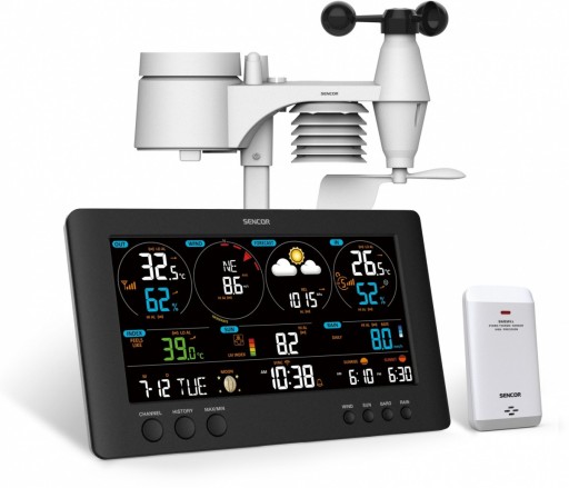 - Pozostałe parametry: Obsługa globalnych publicznych platform meteorologicznych Weather Underground " oraz Weathercloud " Publikowanie danych z lokalnej stacji meteorologicznej na publicznych platformach meteorologicznych Obsługa urządzeń inteligentnych, dostęp do danych online oraz historii TRUE BLACK LCD Wyświetlacz z przekątną 8,4 " (21,4 cm) Regulacja kontrastu wyświetlacza LCD umożliwiająca dostosowanie kąta widzenia Prognoza na 12 ~ 24 godzin oparta na zmianie ciśnienia i temperatury powietrza Ikona prognozy pogody (słonecznie, lekkie zachmurzenie, zachmurzenie, deszcz, burza, śnieg) Pomiar temperatury i wilgotności wewnętrznej ze wskaźnikiem komfortu i rozwoju Pomiar temperatury i wilgotności zewnętrznej ze wskaźnikiem rozwoju Pomiar ciśnienia barometrycznego w wartościach absolutnych i względnych (hPa, inHg, mmHg) Zakres pomiarów temperatury wewnętrznej: -5 do 50°C Zakres pomiarów temperatury zewnętrznej: od -40°C do +60°C Zakres pomiarów wilgotności wewnętrznej: 1% do 90% RH Zakres pomiarów wilgotności zewnętrznej: 1% do 99% RH Wskaźnik temperatury odczuwalnej pod wpływem chłodnego wiatru, punktu rosy i indeksu ciepła Indeks UV (0-16) ze wskaźnikiem UV (lekki, średni, wysoki, bardzo wysoki, ekstremalny) Intensywność światła słonecznego (Klux, Kfc, W/m2) i czas opalania (minuty) Max./min. zapis w pamięci z oznaczeniem czasu i daty Protokół ostatnich 24 godzin Ustawienie alarmu dla temperatury i wilgotności wewnętrznej/zewnętrznej (wysoka/niska) Ustawienie alarmu (indeks meteorologiczny, spadek ciśnienia, wysoka prędkość wiatru oraz silne opady dzienne) Miganie wskaźnika przy aktywnym alarmie wysoki/niski Wyświetlanie czasu, kalendarza, dni w tygodniu, faz księżyca i czasu wschodu i zachodu słońca Ustawienie faz księżyca dla półkuli północnej lub południowej Ostrzeżenie przed gołoledzią i wskaźnik poziom komfortu Porywy wiatru lub średnia prędkość wiatru (w mph, m/s, km/h, węzłach) Skala Beauforta i wskaźnik poziomu prędkości wiatru Aktualnie dominujący kierunek wiatru Pomiar opadów deszczu przy pomocy godzinowej, dziennej, tygodniowej, miesięcznej i łącznej sumy opadów (mm/inch) Automatyczne ustawianie czasu i daty za pośrednictwem WiFi (opcja ustawienia ręcznego) Data i dzień tygodnia (dzień tygodnia w 7 językach: EN, DE, FR, ES, IT, NL, RU) 3 poziomy jasności wyświetlacza: wysoka / niska / automatyczne przyciemnianie Panel solarny do automatycznej regulacji jasności podświetlenia Umieszczenie na stole lub na ścianie Bezprzewodowy czujnik 7w1: Prędkość wiatru, kierunek wiatru, opady deszczu, temperatura, wilgotność, intensywność światła i UV Czujnik TH: SWS TH9898-9770-12500 temperatura, wilgotność Obsługa do 7 czujników bezprzewodowych (SWS TH9898-9770-12500) Kalibracja danych pogodowych (za pomocą interfejsu użytkownika) Obsługa aktualizacji firmware Standard WiFi: 802.11 b/g/n, częstotliwość pracy WiFi: 2,4 GHz