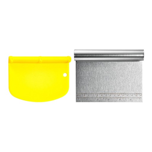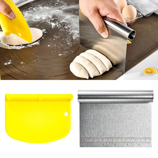 2 w 1: połączenie skrobaka i skrobaka ze stali nierdzewnej, może zeskrobać powierzchnię, zeskrobać mąkę, rozłożyć ciasto, pokroić pizzę itp.